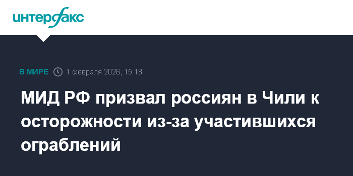 Москва. 1 февраля. INTERFAX.RU - МИД РФ опубликовал предупреждение для россиян о необходимости соблюдения мер личной безопасности в Чили в связи с участившимися случаями нападений с целью ограбления на туристов, в том числе находящихся в этой стране граждан РФ.