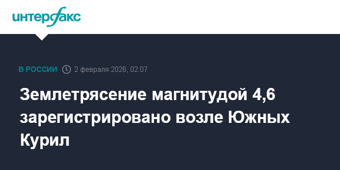 Москва. 2 февраля. INTERFAX.RU - Землетрясение магнитудой 4,6 произошло утром в понедельник в Тихом океане возле Южных Курил Сахалинской области, сообщили "Интерфаксу" в Сахалинском филиале Единой Геофизической службы РАН.