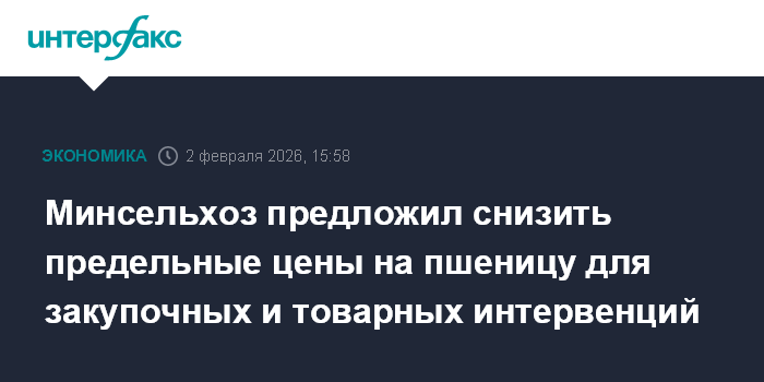 Москва. 2 февраля. INTERFAX.RU - Минсельхоз РФ предлагает снизить предельные цены на пшеницу, при достижении которых в 2026/27 сельхозгоду (с 1 июля 2026 года по 30 июня 2027 года) могут быть проведены закупочные и товарные интервенции. Цены на рожь предложено повысить, на ячмень - оставить на прежнем уровне, следует из проекта приказа ведомства, размещенного на сайте regulation.gov.ru.