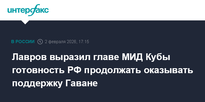 Москва. 2 февраля. INTERFAX.RU - Министр иностранных дел России Сергей Лавров провел телефонный разговор с главой МИД Кубы Бруно Родригесом, выразил готовность продолжить оказывать стране необходимую политическую и материальную поддержку, сообщили на Смоленской площади.