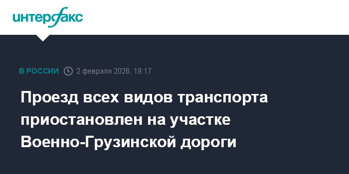 Москва. 2 февраля. INTERFAX.RU - Движение всех видов транспорта временно остановлено на участке Военно-Грузинской дороги в Северной Осетии, сообщает пресс-служба Главного управления МЧС по республике в понедельник.