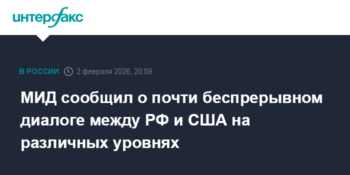 Москва. 2 февраля. INTERFAX.RU - В МИД РФ заявили в понедельник, что российско-американский диалог ведётся практически беспрерывно на различных уровнях и в нескольких форматах, а также отметили, что настроены конструктивно в отношении будущего диалога.