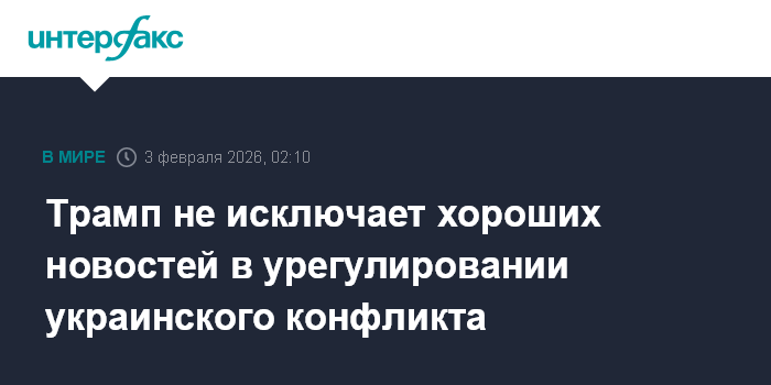 Москва. 3 февраля. INTERFAX.RU - Президент США Дональд Трамп считает, что урегулирование украинского конфликта идет хорошо, и в скором времени можно ждать положительных новостей.
