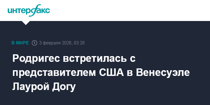 Москва. 3 февраля. INTERFAX.RU - Временный президент Венесуэлы Делси Родригес во вторник провела в Каракасе переговоры с поверенным в делах США в Венесуэле Лаурой Догу, сообщает правительство республики.
