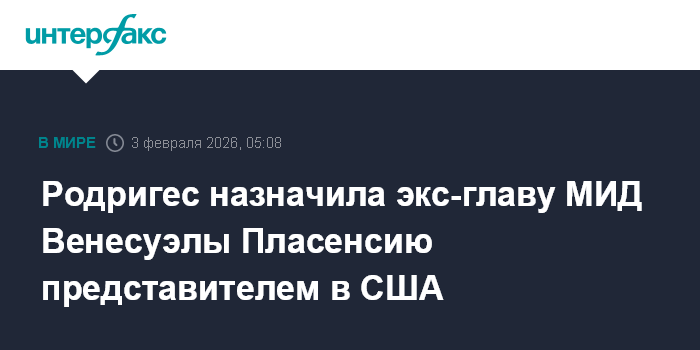 Москва. 3 февраля. INTERFAX.RU - Исполняющая обязанности президента Венесуэлы Делси Родригес назначила экс-главу МИД Феликса Пласенсию своим представителем в США, сообщает Bloomberg.