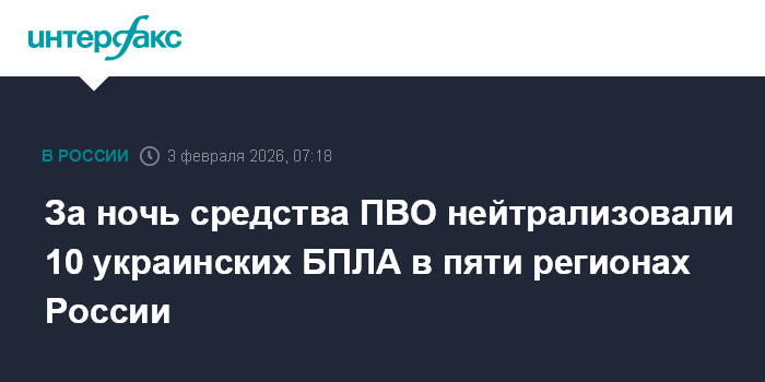 Москва. 3 февраля. INTERFAX.RU - В течение прошедшей ночи дежурные средства ПВО уничтожили и перехватили 10 беспилотников в Белгородской, Орловской, Калужской, Курской и Ростовской областях, сообщили в Министерстве обороны.