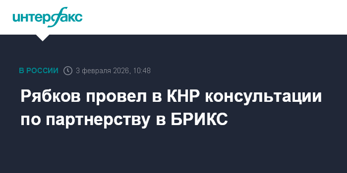 Москва. 3 февраля. INTERFAX.RU - Замглавы МИД РФ Сергей Рябков провел консультации в Китае по тематике БРИКС и вопросам стратегической стабильности, сообщили в МИД России.