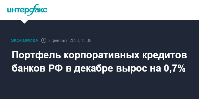 Москва. 3 февраля. INTERFAX.RU - Корпоративный кредитный портфель банков РФ в декабре увеличился на 0,7% против прироста в 2% в ноябре, в целом за 2025 год корпоративное кредитование выросло на 11,6% против 18,7% по итогам 2024 года, следует из статистики ЦБ РФ.