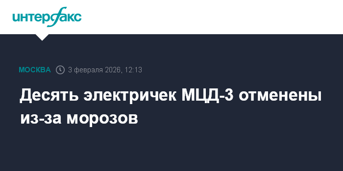 Москва. 3 февраля. INTERFAX.RU - На Ленинградском направлении Октябрьской железной дороги отменены десять пригородных поездов третьей линии Московских центральных диаметров (МЦД-3; D3) в связи с утренними сбоями из-за морозов, сообщили в Московско-Тверской пригородной пассажирской компании.