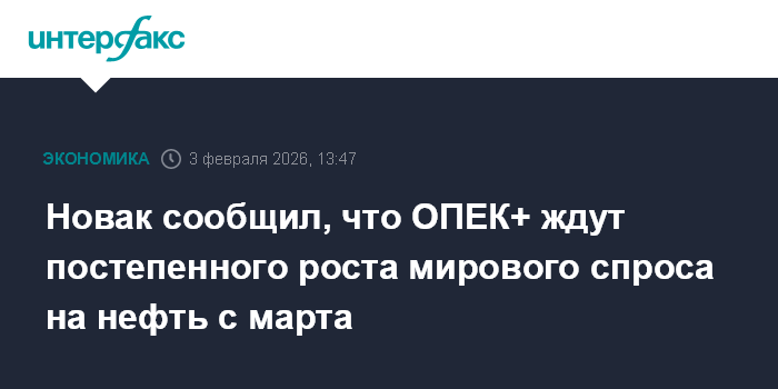 Москва. 3 февраля. INTERFAX.RU - ОПЕК+ ожидает постепенное увеличение мирового спроса на нефть с марта, пока же на глобальном рынке сохраняется баланс, сообщил журналистам вице-премьер Александр Новак.