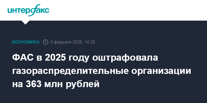 Москва. 3 февраля. INTERFAX.RU - Федеральная антимонопольная служба (ФАС) в 2025 году штрафовала газораспределительные организации (ГРО) на 363,3 млн рублей, сообщила пресс-служба ведомства.