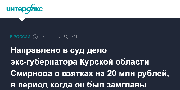 "По версии следствия, в период с июня 2022 по апрель 2023 года Дедов со Смирновым при посредничестве Шубина получили взятки в размере более 20 млн рублей от представителей коммерческих организаций" , - сообщили в Генпрокуратуре. В это время Смирнов и Шубин занимали посты заместителей губернатора Курской области.
