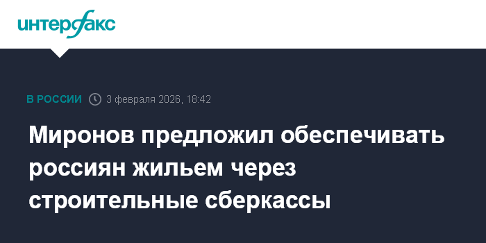 Москва. 3 февраля. INTERFAX.RU - Вопросы обеспечения граждан России жильем следует решать за счет строительных сберкасс, заявил руководитель партии "Справедливая Россия" Сергей Миронов на встрече с премьер-министром Михаилом Мишустиным.