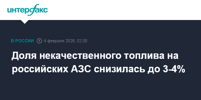Москва. 4 февраля. INTERFAX.RU - Уровень некачественного топлива на автозаправочных станциях (АЗС) в России понизился до 3,5-4%, сообщил руководитель Федерального агентства по техническому регулированию и метрологии (Росстандарт) Антон Шалаев.