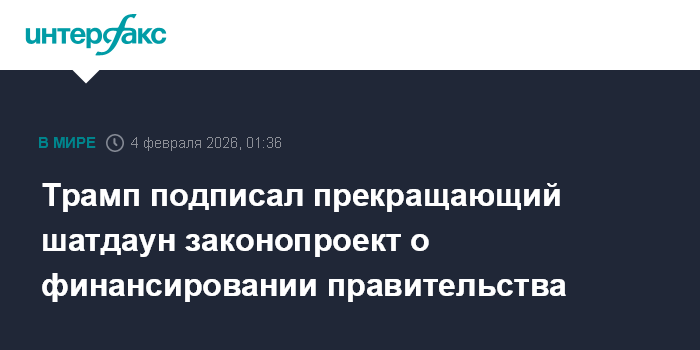 Москва. 4 февраля. INTERFAX.RU - Президент США Дональд Трамп подписал законопроект о финансировании правительства, который прекращает длившуюся с субботы частичную приостановку работы федеральных структур.