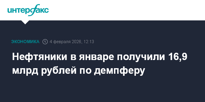 Москва. 4 февраля. INTERFAX.RU - Выплаты из российского бюджета нефтяным компаниям по топливному демпферу в январе 2026 года составили 16,9 млрд рублей, сообщается в материалах о формировании и использовании дополнительных нефтегазовых доходов федерального бюджета на сайте Минфина.