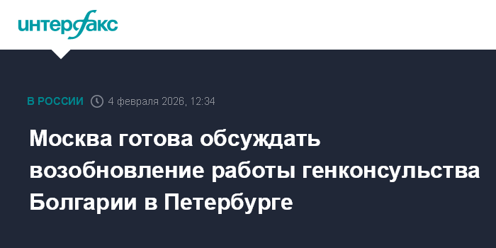 Москва. 4 февраля. INTERFAX.RU - Россия не отзывала согласие на открытие генконсульства Болгарии в Петербурге и готова вернуться к обсуждению возобновления его работы, сообщил журналистам представитель МИД России в северной столице Максим Полетаев.