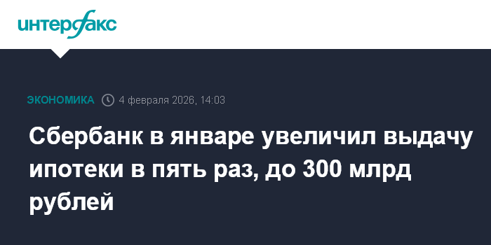 Москва. 4 февраля. INTERFAX.RU - Сбербанк в январе 2026 года увеличил выдачу ипотеки в пять раз по сравнению с январем 2025 года - до 300 млрд рублей, говорится в сообщении кредитной организации со ссылкой на данные сервиса "Домклик".