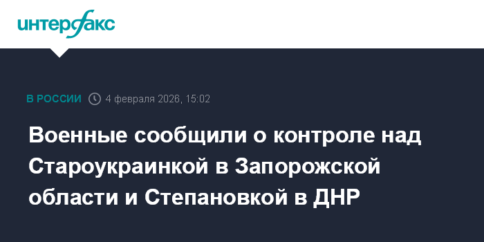 Москва. 4 февраля. INTERFAX.RU - Российские военнослужащие взяли под контроль села Степановка в ДНР и Староукраинка в Запорожской области, заявили в Минобороны России в среду.