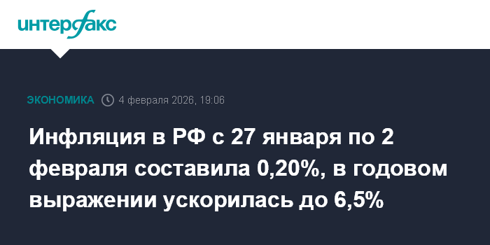Инфляция в РФ с 27 января по 2 февраля составила 0,20%, в годовом выражении ускорилась до 6,5%