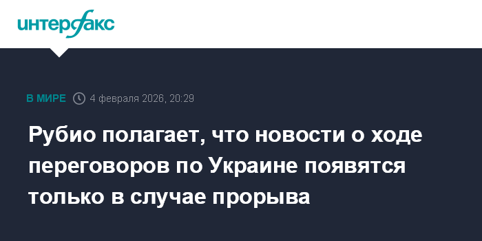 Москва. 4 февраля. INTERFAX.RU - Госсекретарь США Марко Рубио считает, что о дальнейшем прогрессе на переговорах по украинскому урегулированию вряд ли будет известно до тех пор, пока стороны не добьются реального прорыва.