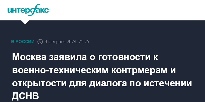 Москва. 4 февраля. INTERFAX.RU - МИД РФ в связи с истечением срока действия российско-американского Договора о СНВ заявил, что Россия готова к военно-техническим контрмерам для купирования угроз, но остается открытой для поиска политико-дипломатических путей комплексной стабилизации стратегической обстановки.
