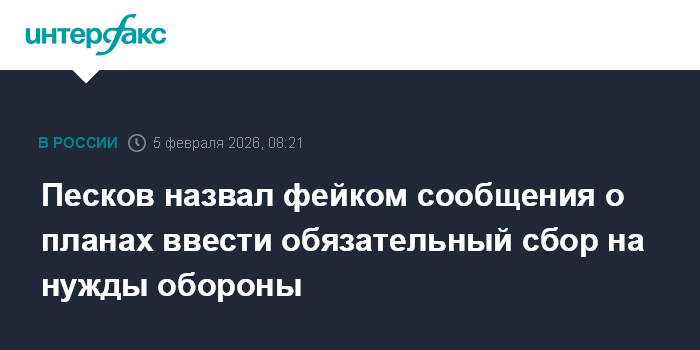 Москва. 5 февраля. INTERFAX.RU - В Кремле назвали "фейком среднего качества" появившиеся в интернете сообщения о планах ввести в РФ обязательный сбор на нужды обороны.