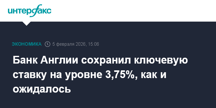Москва. 5 февраля. INTERFAX.RU - Банк Англии сохранил ключевую процентную ставку на уровне 3,75% годовых, говорится в сообщении британского ЦБ.
