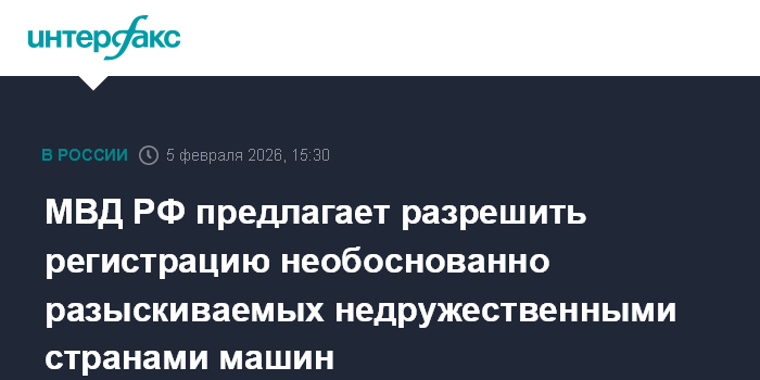 Москва. 5 февраля. INTERFAX.RU - В МВД России выступили за снятие запрета на регистрацию автомобилей, находящихся в международном розыске по инициативе недружественных государств, соответствующий проект федерального закона размещен на портале проектов нормативных правовых актов.