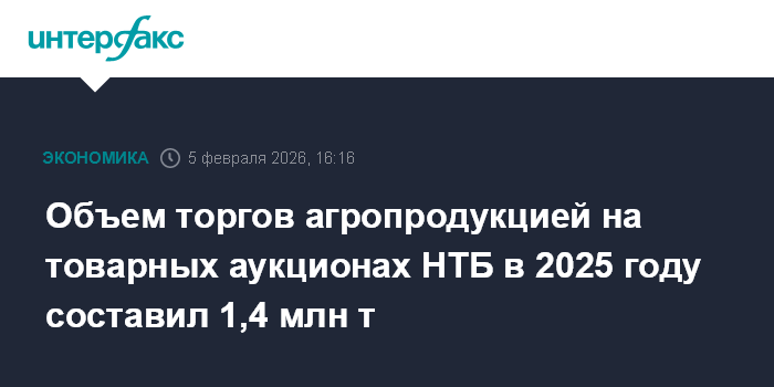 Москва. 5 февраля. INTERFAX.RU - Объем торгов агропродукцией на товарных аукционах Национальной товарной биржи (НТБ) в 2025 году составил 1,4 млн тонн, было заключено свыше 4,9 тыс. сделок, сообщает торговая площадка.