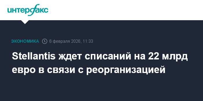 Москва. 6 февраля. INTERFAX.RU - Европейский автоконцерн Stellantis зафиксирует списание в размере около 22 млрд евро в связи с изменением бизнес-стратегии, сообщила компания.