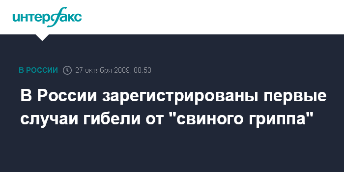 Москва. 27 октября. INTERFAX.RU - Первые два случая смерти от "свиного" гриппа зарегистрированы в России, сообщил во вторник "Интерфаксу" глава Роспотребнадзора, главный государственный санитарный врач РФ Геннадий Онищенко.