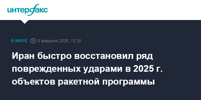 Москва. 6 февраля. INTERFAX.RU - Иранские власти оперативно провели ремонтные работы на части объектов, связанных с программой баллистических ракет и получивших повреждения при ударах в 2025 году, сообщает The New York Times (NYT) со ссылкой на спутниковые данные.