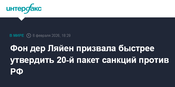 Москва. 6 февраля. INTERFAX.RU - Еврокомиссия (ЕК) обнародовала в пятницу свое предложение по 20-му пакету санкций против РФ и желает, чтобы Совет ЕС (государства-члены) утвердил его, как можно скорее.