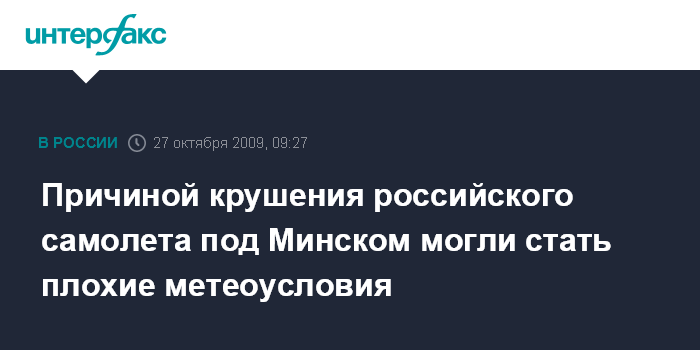 Москва. 27 октября. INTERFAX.RU - Предварительной причиной крушения самолета, вылетевшего из Внуково в Минск, стали плохие метеоусловия, при которых экипаж не справился с заходом на посадку, сообщили "Интерфаксу" источники в Минтрансе России.