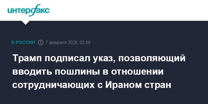 Москва. 7 февраля. INTERFAX.RU - Президент США Дональд Трамп разрешил своей администрации вводить пошлины на товары из стран, ведущих бизнес с Ираном, но воздержался от их немедленного введения.