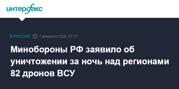 Москва. 7 февраля. INTERFAX.RU - Российские военные прошлой ночью уничтожили 82 украинских беспилотника, сообщило Минобороны РФ в субботу.