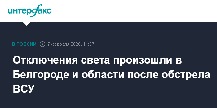 Москва. 7 февраля. INTERFAX.RU - Губернатор Белгородской области Вячеслав Гладков сообщил об обстреле со стороны ВСУ областного центра, произошло отключение энергоснабжения.