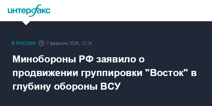 Москва. 7 февраля. INTERFAX.RU - Группировка войск "Восток" за сутки продвинулась в глубину обороны ВСУ, группировки "Центр" и "Запад" заняли более выгодные рубежи и позиции, заявили в Минобороны РФ в субботу.