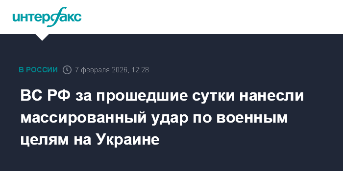 Москва. 7 февраля. INTERFAX.RU - Российская армия нанесла массированный удар по военным целям на территории Украины, заявили в Минобороны РФ в субботу.