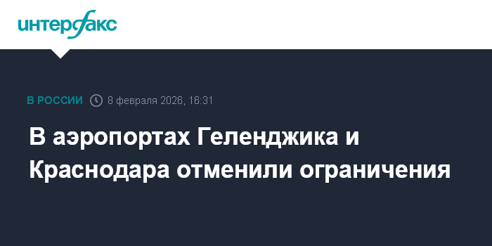 Москва. 8 февраля. INTERFAX.RU - Отменены временные ограничения, введенные ранее в аэропортах Геленджика и Краснодара, сообщается в воскресенье в телеграм-канале Росавиации.
