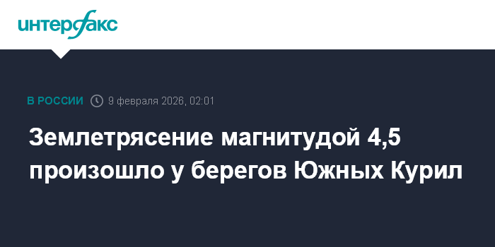 Москва. 9 февраля. INTERFAX.RU - Землетрясение магнитудой 4,5 зарегистрировано рано утром в понедельник в Тихом океане возле Южных Курил Сахалинской области, сообщили "Интерфаксу" в Сахалинском филиале Единой Геофизической службы РАН.