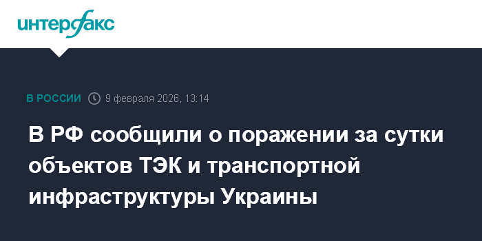 Москва. 9 февраля. INTERFAX.RU - Российские военнослужащие в течение суток нанесли поражение инфраструктуре военного аэродрома Украины, объектам топливно-энергетического комплекса и транспортной инфраструктуры, заявили в Минобороны России в понедельник.