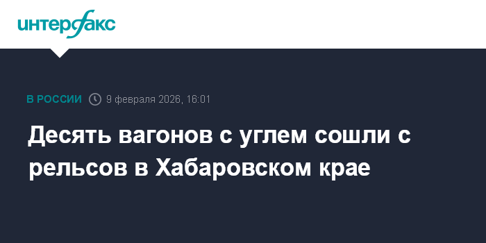 Москва. 9 февраля. INTERFAX.RU - Десять вагонов с углем сошли с рельсов на перегоне Датта-Кенада между станциями Высокогорная и Советская Гавань в Хабаровском крае. Об этом сообщает пресс-служба Дальневосточной транспортной прокуратуры в понедельник.