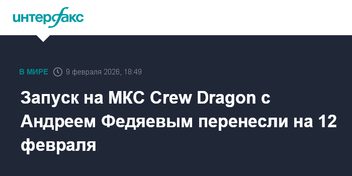 Москва. 9 февраля. INTERFAX.RU - Запуск корабля Crew Dragon с российским космонавтом Андреем Федяевым к МКС с мыса Канаверал перенесен на 12 февраля и состоится не ранее 13:38 по московскому времени, сообщил "Роскосмос" со ссылкой на NASA