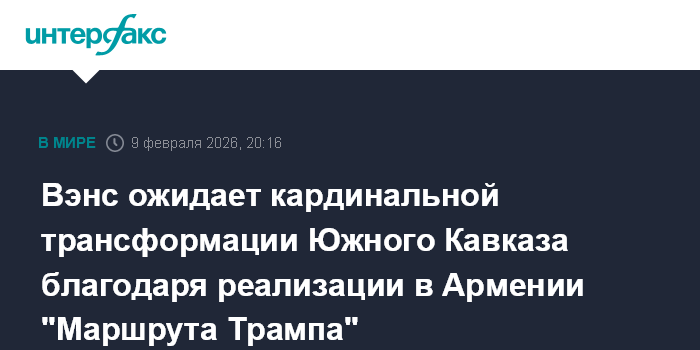 Москва. 9 февраля. INTERFAX.RU - Реализация проекта "Маршрут Трампа во имя международного мира и процветания" (Trump Route for International Peace and Prosperity, TRIPP) кардинально изменит регион Южного Кавказа, заявил вице-президент США Джей Ди Вэнс.
