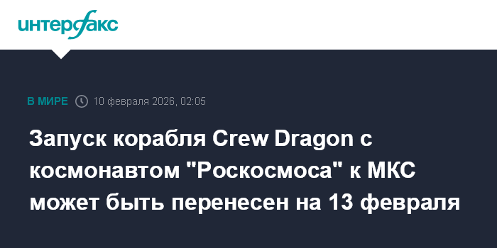 Москва. 10 февраля. INTERFAX.RU - Запуск корабля Crew Dragon с российским космонавтом Андреем Федяевым в составе экипажа к Международной космической станции (МКС) может быть вновь перенесен на сутки и стоится лишь 13 февраля, следует из данных NASA.