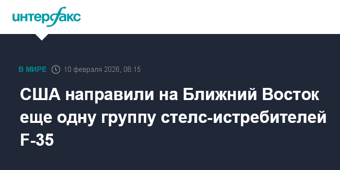 Москва. 10 февраля. INTERFAX.RU - Соединенные Штаты направили на Ближний Восток еще одну группу из шести стелс-истребителей пятого поколения F-35A Lightning II, сообщило издание Air and Space Forces Magazine.
