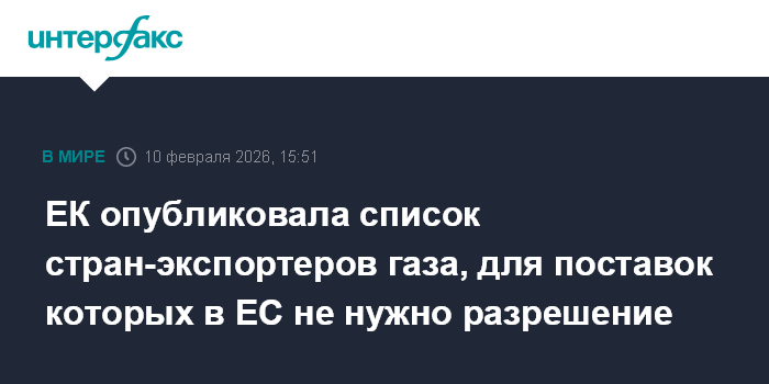 Москва. 10 февраля. INTERFAX.RU - Постановление Еврокомиссии (ЕК), касающееся импорта газа в ЕС, с перечислением стран, для поставок из которых не нужно получать разрешение, опубликовано во вторник в "Официальном журнале" Европейского союза.