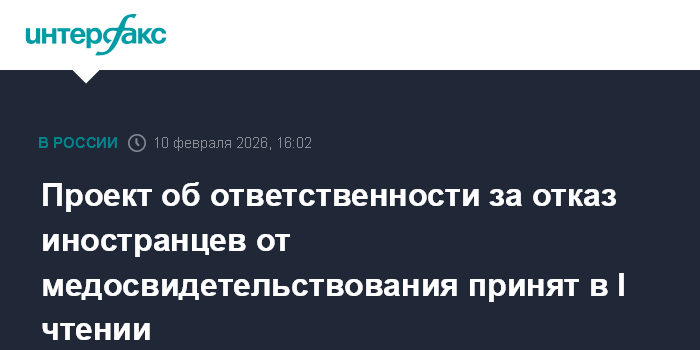 Москва. 10 февраля. INTERFAX.RU - Госдума на заседании во вторник приняла в первом чтении законопроект об установлении административной ответственности за отказ или уклонение иностранного гражданина или лица без гражданства от медицинского освидетельствования.